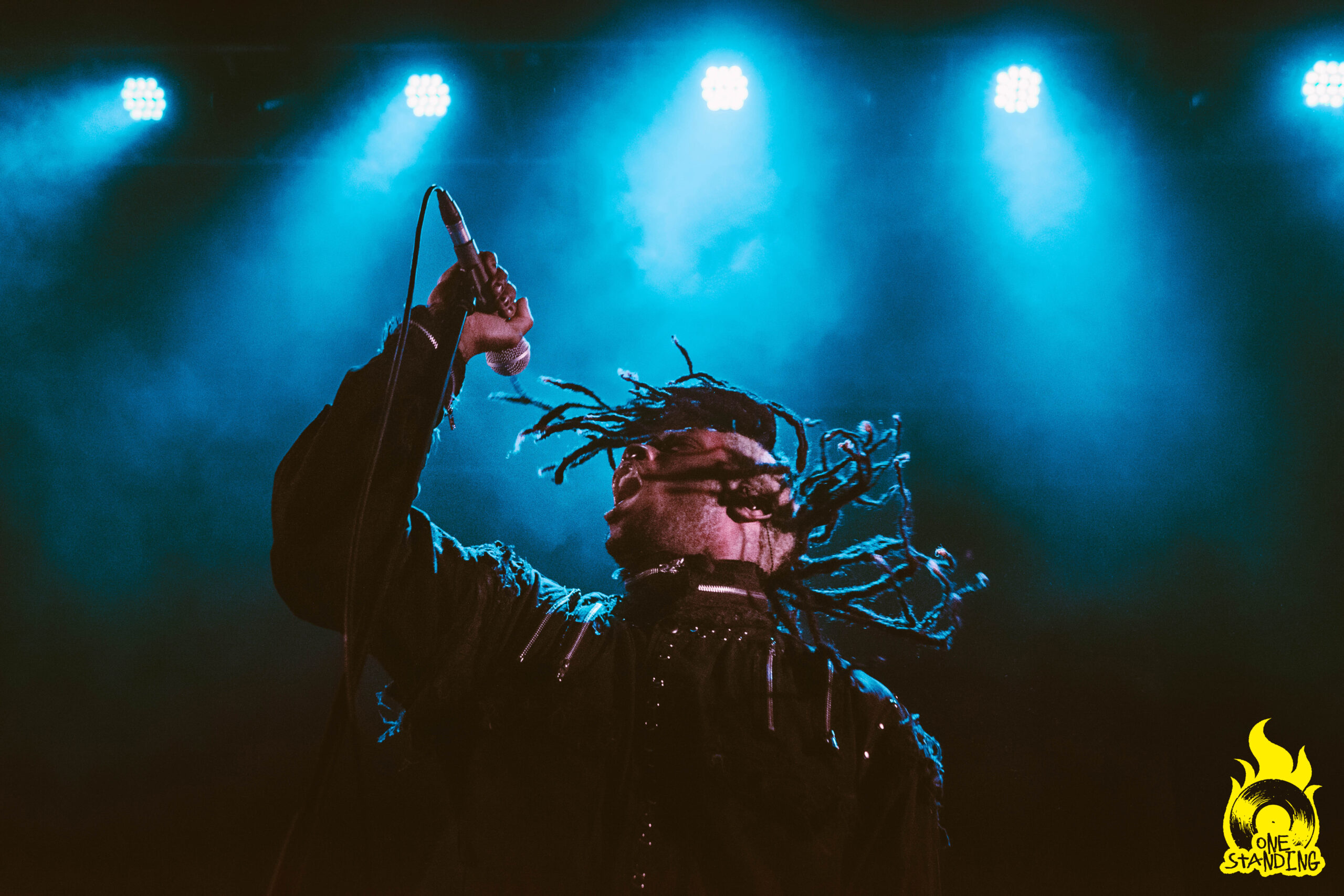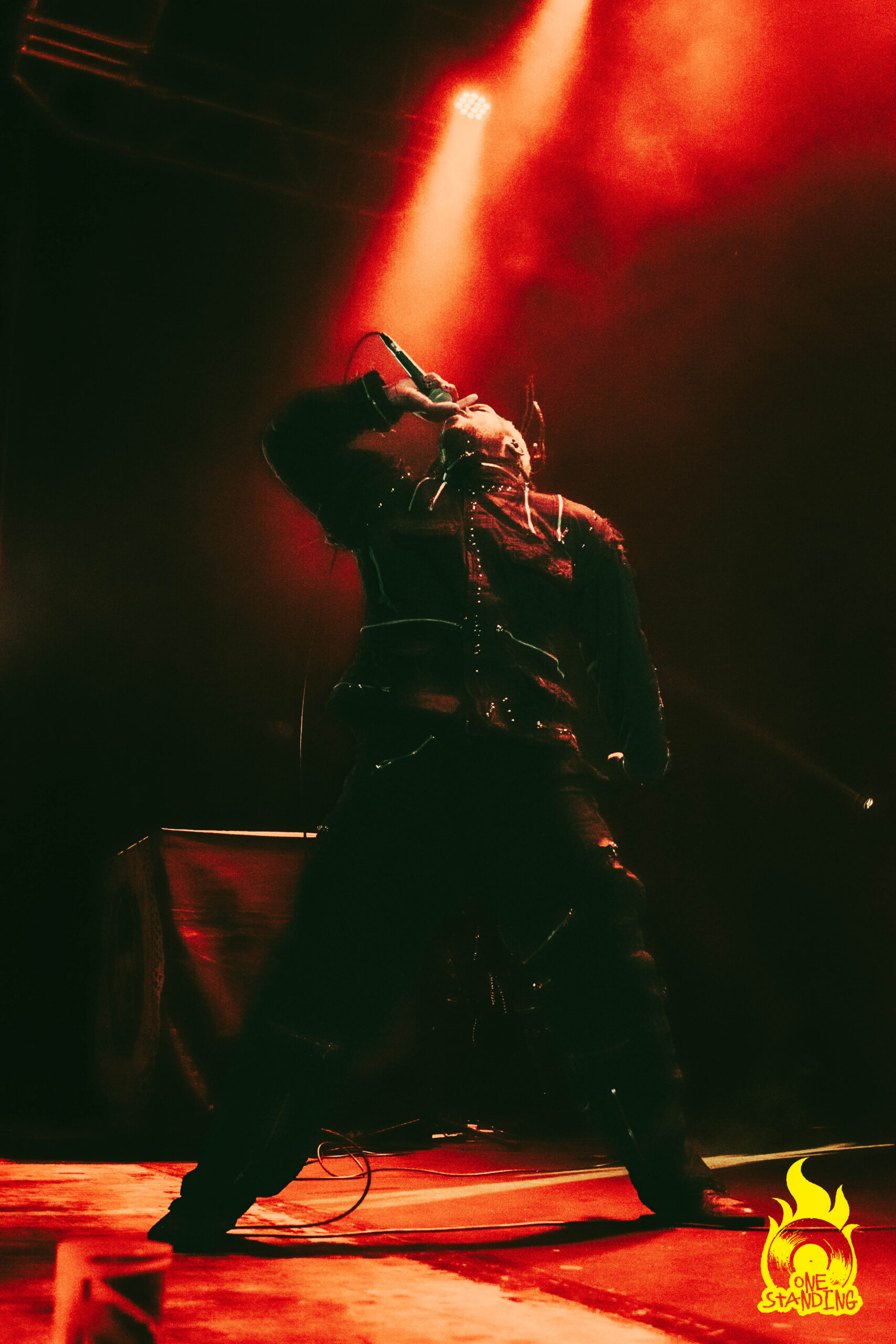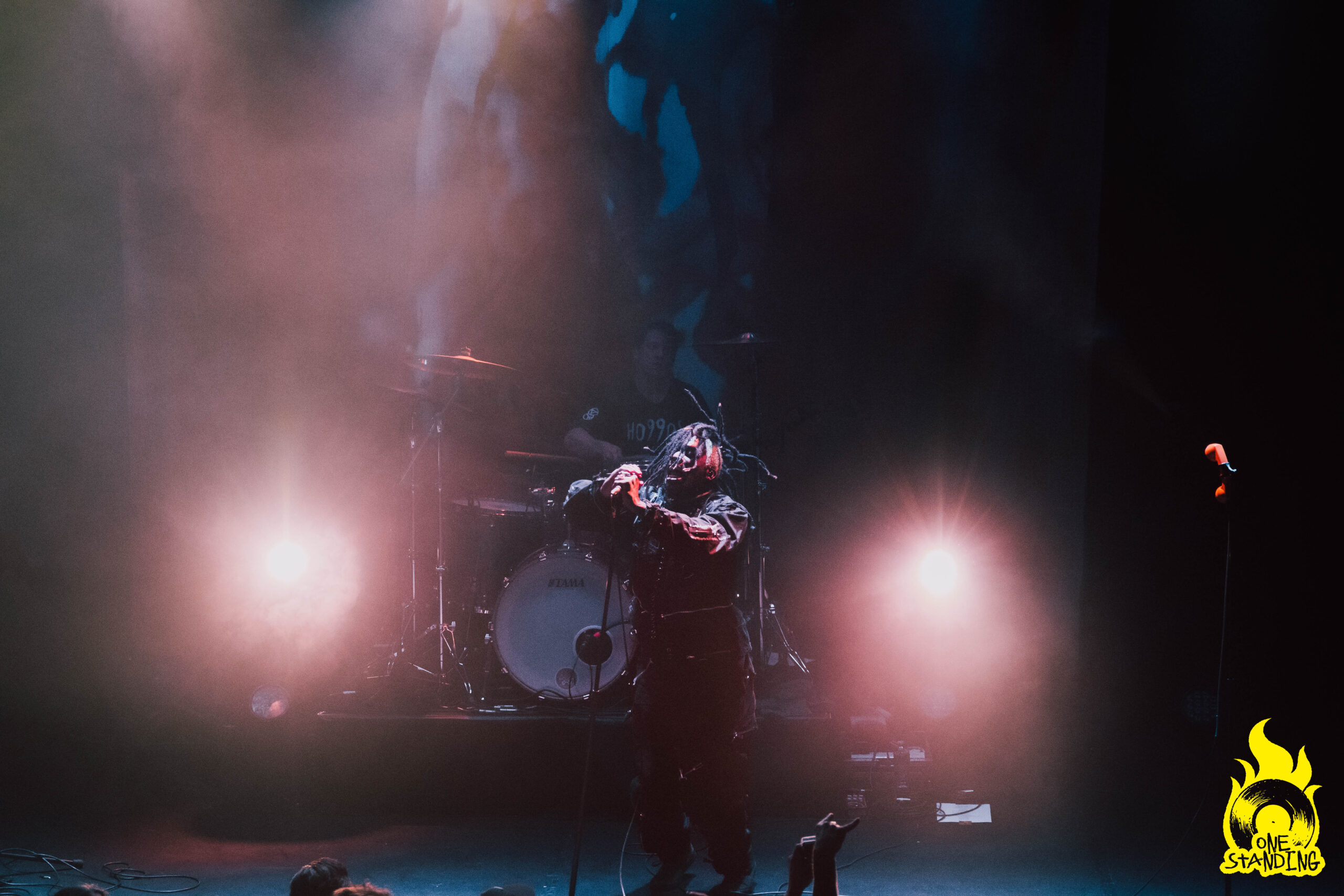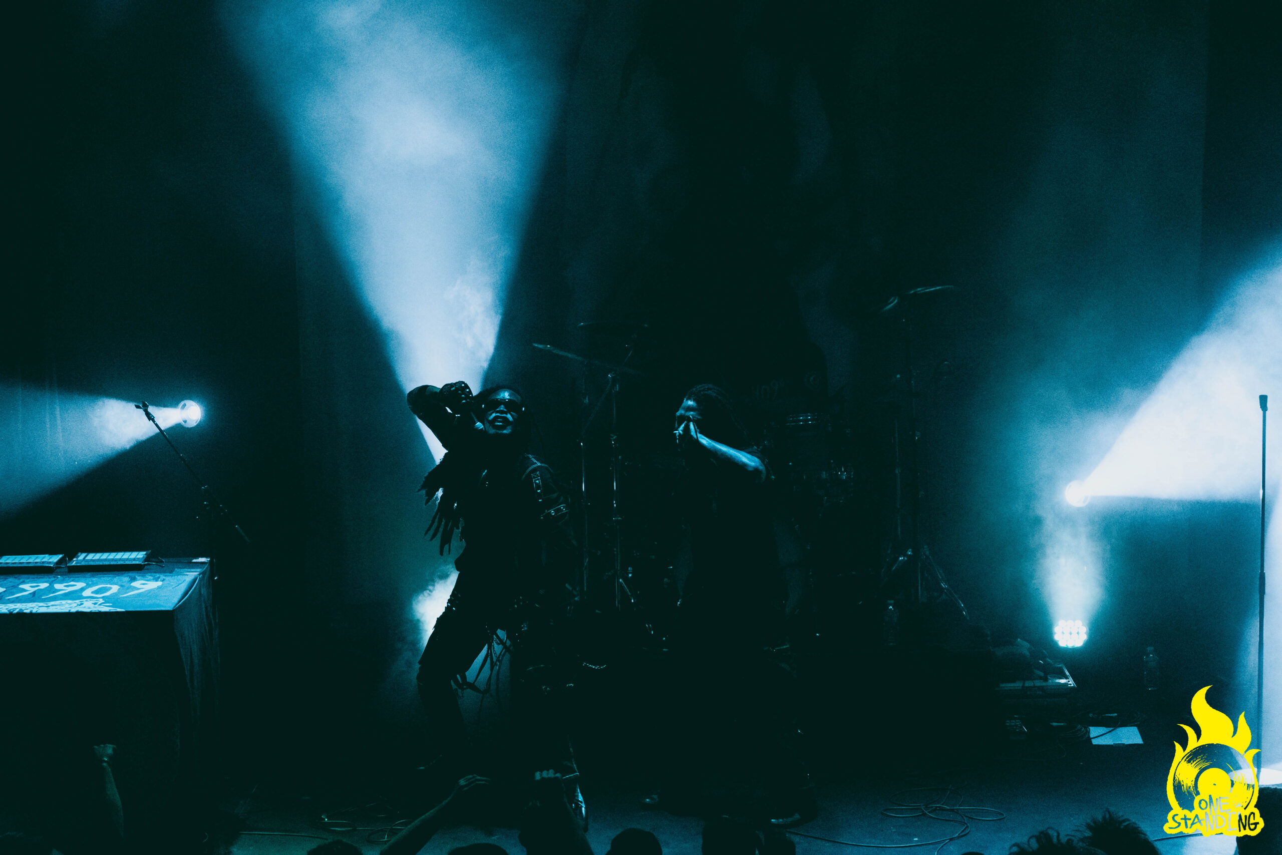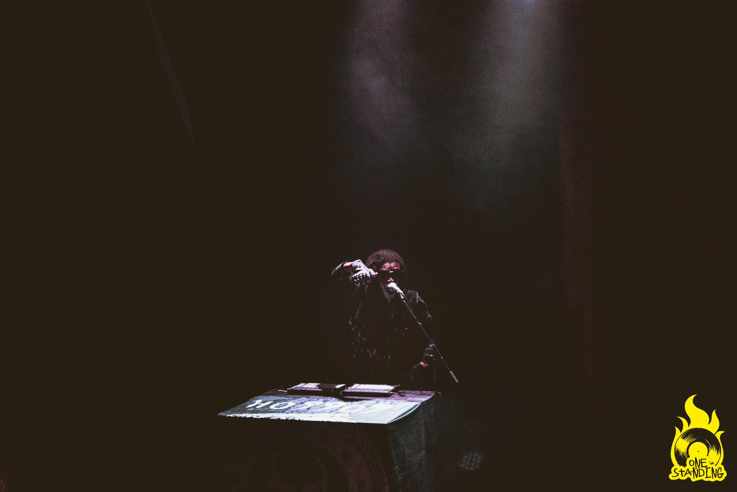 Affublé d’un costume aux allures horrifiques, theOGM débarque sur scène. Une toute petite lumière éclaire son visage maquillé. Si le groupe est souvent associé à Rob Zombie par ses visuels macabres, le portrait qui se dessine dans la pénombre est d’un niveau supérieur. Le multi-instrumentiste est ensuite rejoint par le chanteur Eaddy et le batteur Brandon Pertzborn (Black Flag).